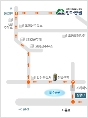- 성석초등학교 지나 마골오거리에서 칠성가구 앞 2시 방향(청아로)으로 우회전 후 3분 직진하면 청아공원 도착